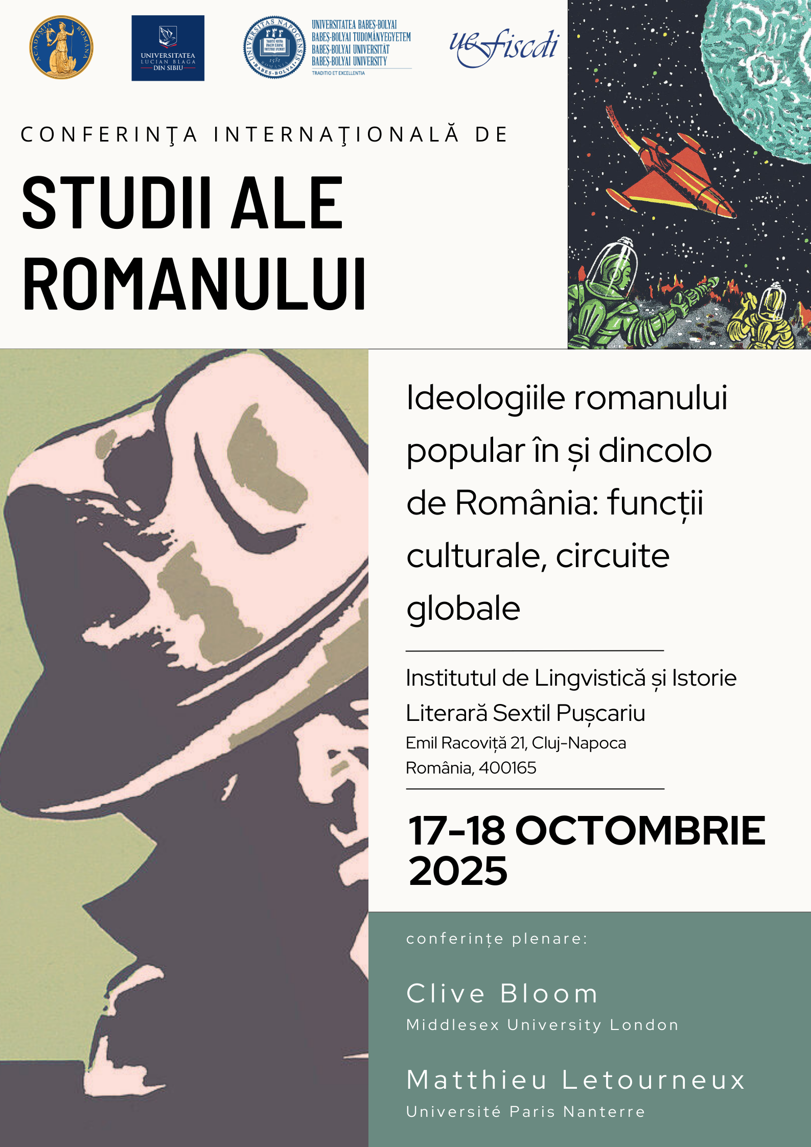 Conferințele plenare sunt susținute de profesorii Clive Bloom (Universitatea Middlesex din Londra) și Matthieu Letourneux (Universitatea Paris Nanterre) și abordează dimensiunile ideologice, culturale și transnaționale ale ficțiunii populare. Prima intervenție, „Fangs for the Memory: Why We Still Love Nineteenth-Century Horror Tropes”, examinează persistența motivelor horror din secolul al XIX-lea și modul în care acestea continuă să structureze imaginarul literar și cinematografic contemporan, în timp ce cea de-a doua, „A (Popular) European Culture? The International Circulation of Serial Fictions and the Sedimentation of Collective Imaginaries”, explorează circulația internațională a ficțiunilor seriale și contribuția lor la formarea unei culturi populare europene comune. Ambele comunicări vor fi susținute în limba engleză.