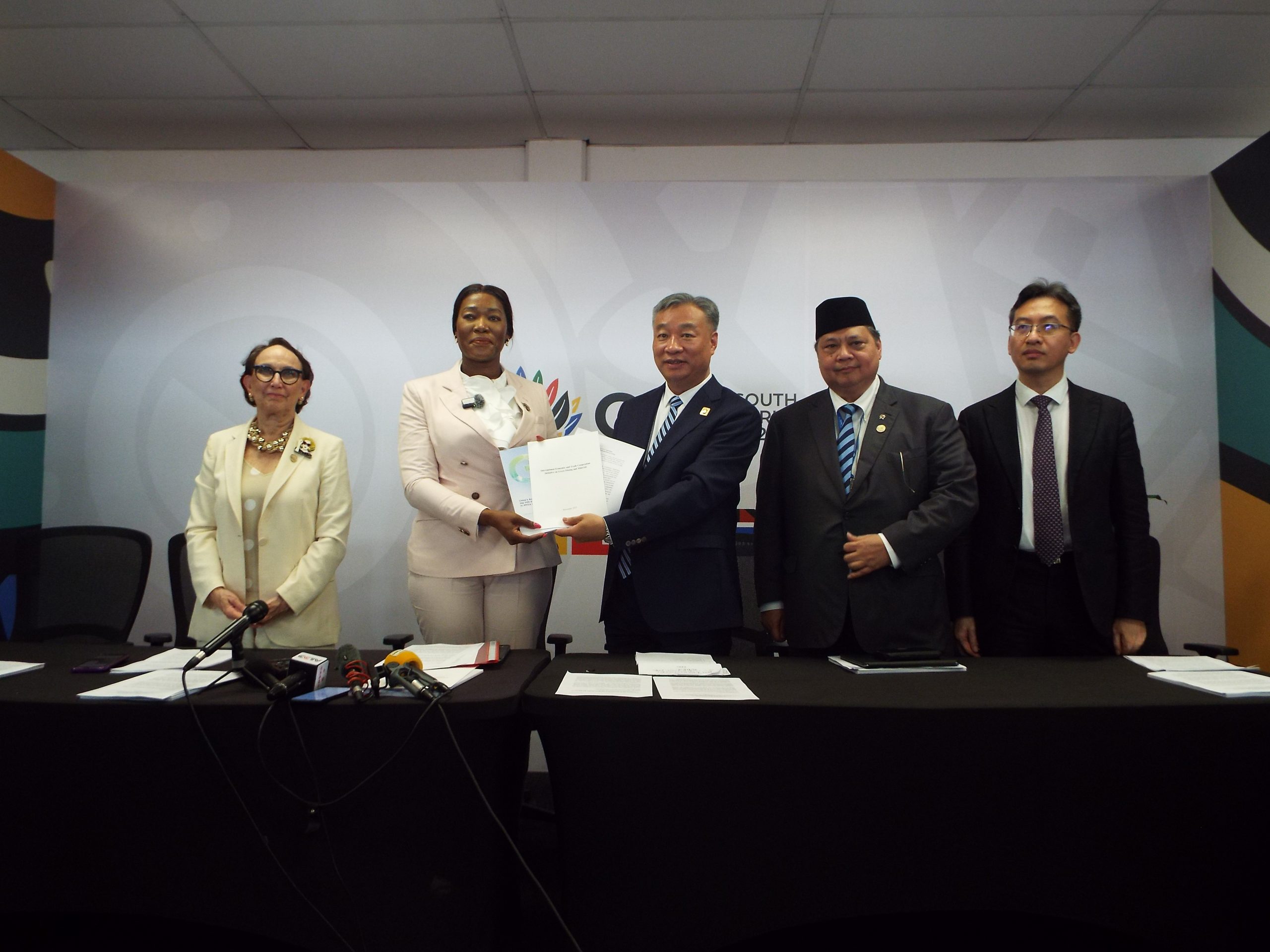 Viceministrul sud-african al Relațiilor Internaționale și Cooperării, Anna Thandi Moraka și viceministrul de Externe al R.P. Chineze Miao Deyu ținând documentul Inițiativei privind cooperarea în sprijinul modernizării în Africa la finalul conferinței de presă