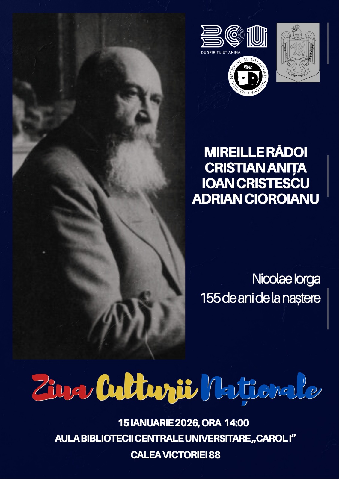 Joi, 15 ianuarie 2026, ora 14:00, Biblioteca Centrală Universitară „Carol I”, în colaborare cu Arhivele Naționale ale României și Muzeul Național al Literaturii Române, organizează în aula sa conferința „Nicolae Iorga: 155 de ani de la naștere”, eveniment dedicat Zilei Culturii Naționale. Manifestarea își propune să aducă în atenția publicului una dintre cele mai complexe și influente personalități ale culturii românești, într-un cadru de reflecție și dialog academic.